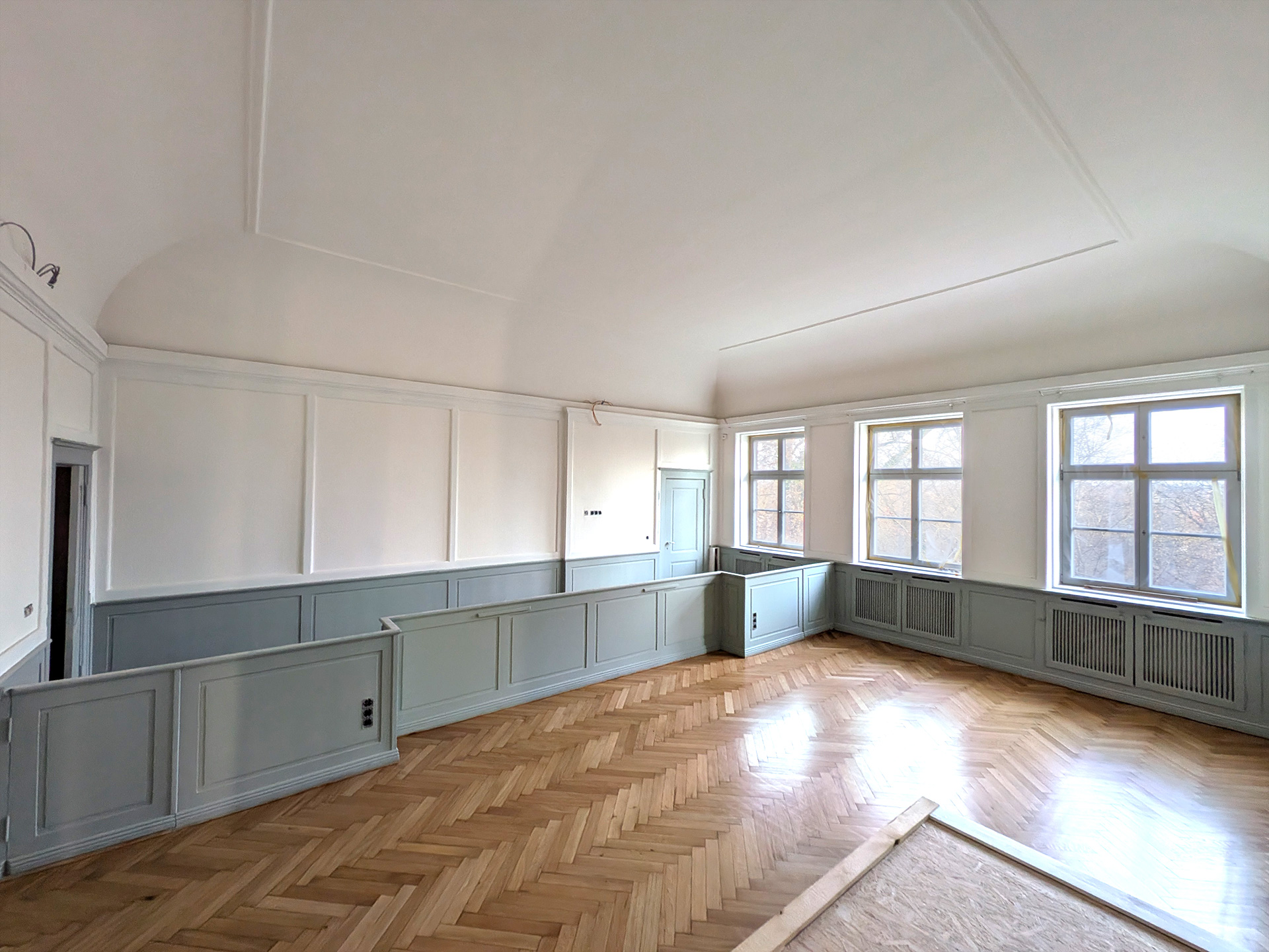 Im Zusammenspiel mit dem Graugrün des Lambris, der Eiche des Fischgrätparketts und der weißen Wandgestaltung entsteht ein harmonischer Dreiklang, der dem Raum eine fast meditative Atmosphäre verleiht.