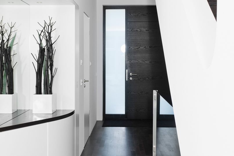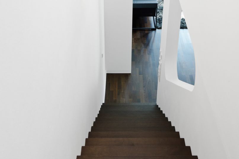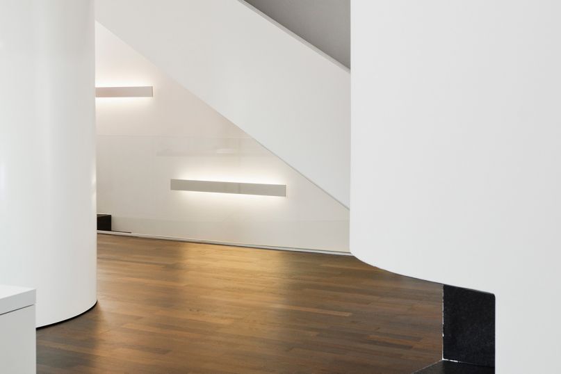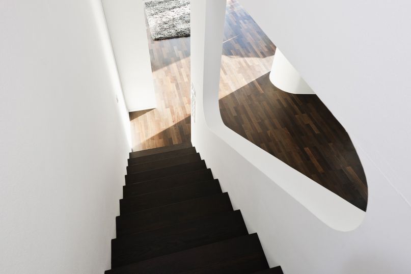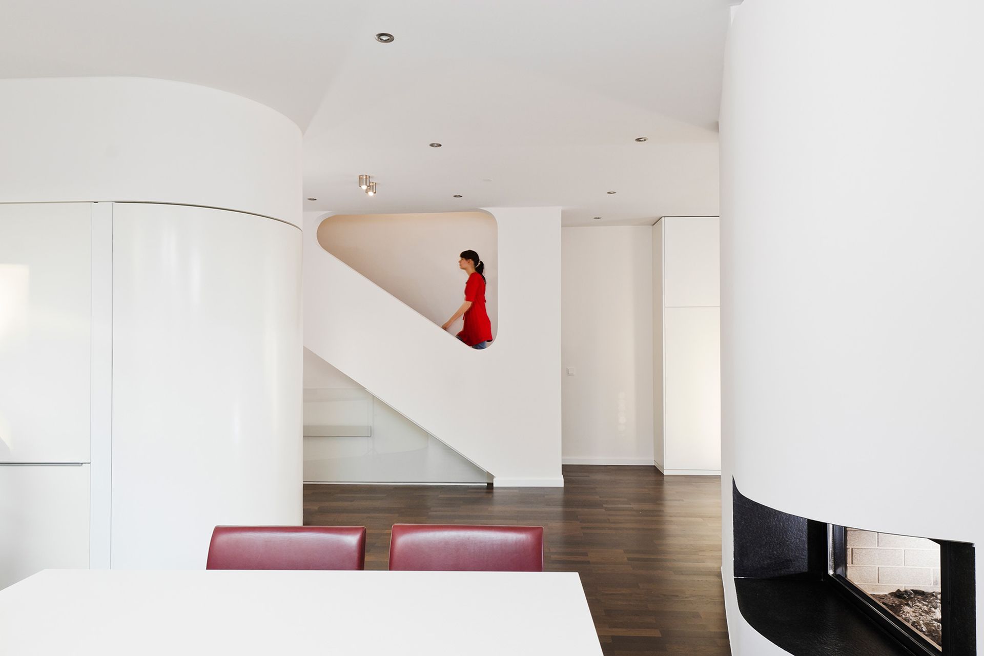 Weiche Formen, fließende Räume und wertige Materialien inszenieren den offenen Lebensraum im Erdgeschoss. Innerhalb der orthogonalen Architektur kreieren die freien Winkel der eingestellten Möbelkörper immer wieder neue und spannungsvolle Raumeindrücke.