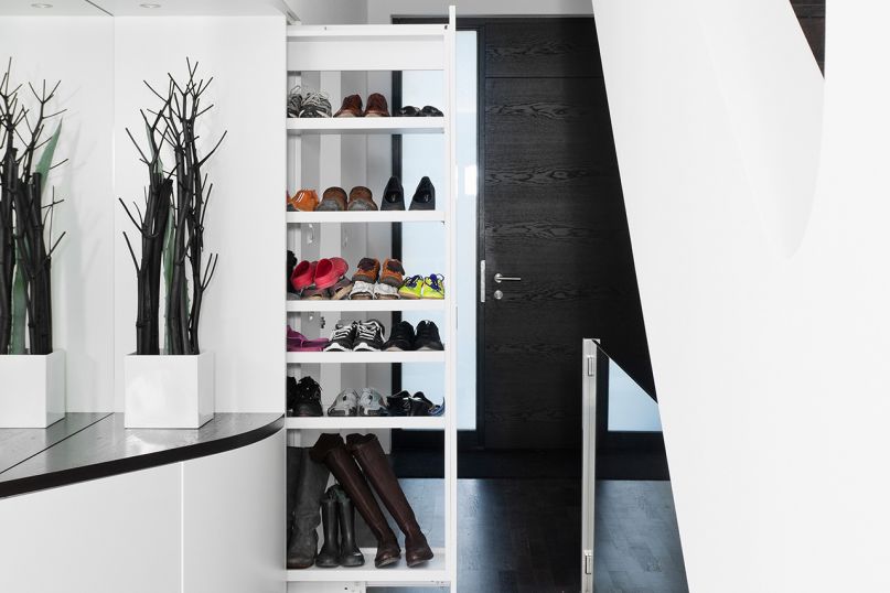 Zwei weiße Körper, die es in sich haben: Ob Holzofen, Flatscreen, Stauraum, WC oder Garderobe - die beiden sind wahre Alleskönner. Mit ihren sanften Rundungen organisieren sie den gesamten Grundriss im Erdgeschoss und schaffen ein ebenso offenes wie differenziertes Raumkontinuum. Zeitlos, stilsicher und selbstbewusst erweisen sie sich von innen wie von außen als ausgesprochen fotogen.