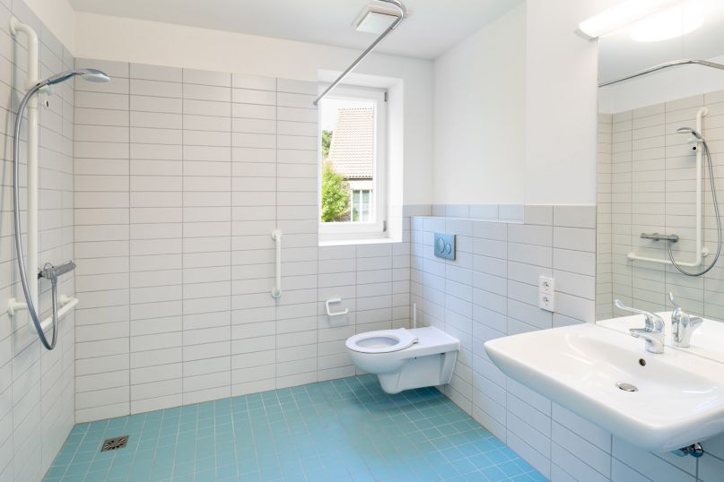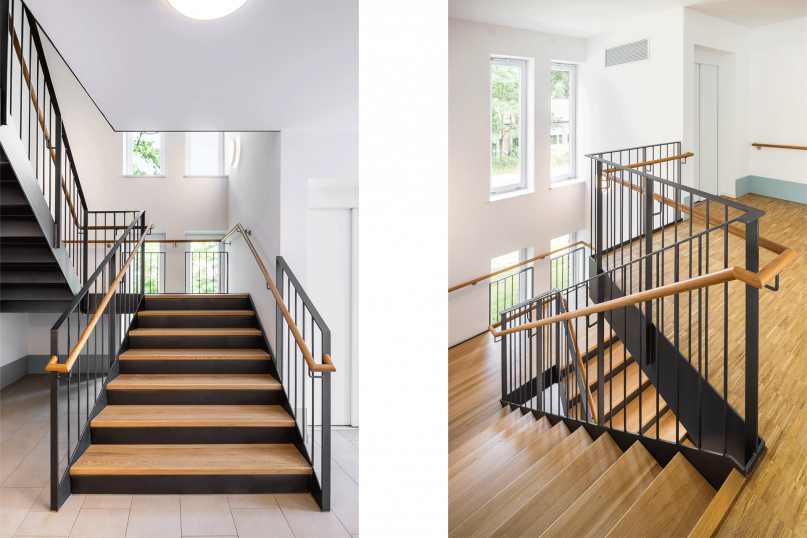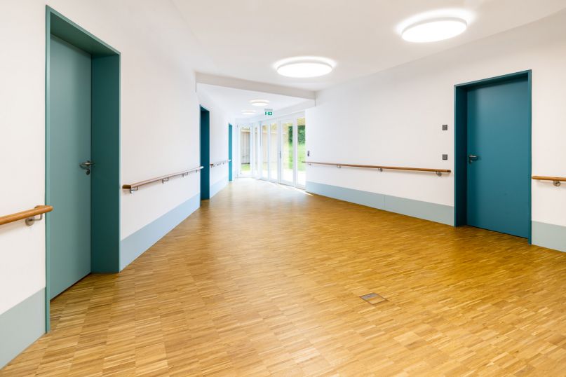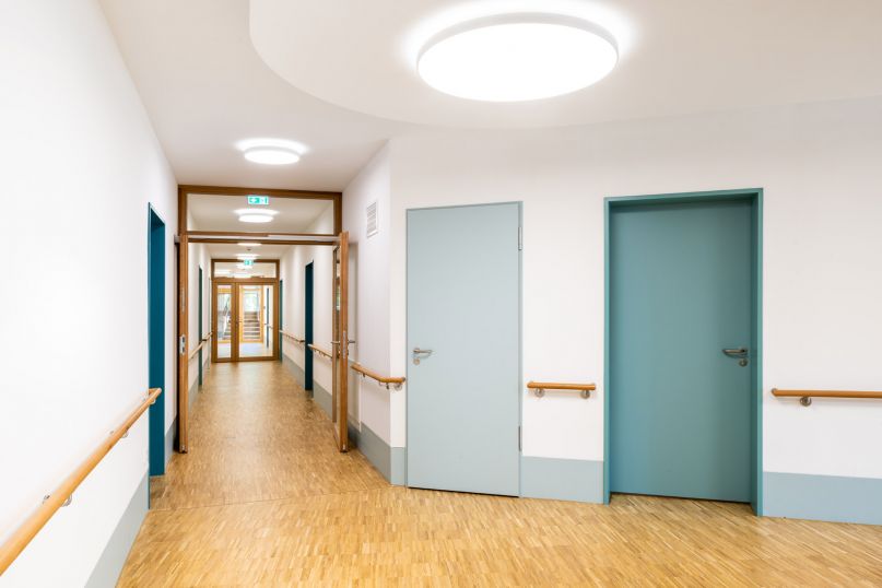 An seinen Enden und Wendepunkten weitet sich der Flur zu großzügigen Aufenthaltsbereichen. Mit bodentiefen Fenstern verbindet er sich mit dem Nachbargebäude, dem angrenzendem Treppenhaus und den Außenterrassen. Der honigfarbene Holzboden vermittelt Wärme und festen Grund, Handläufe aus Eiche geben sicheren Halt und die farbigen Türen in frischem Petrol und hellen Blautönen bieten Orientierung und Rhytmus. Dieses Farbspiel setzt sich in den barrierefreien Bädern der Bewohnerzimmer fort.