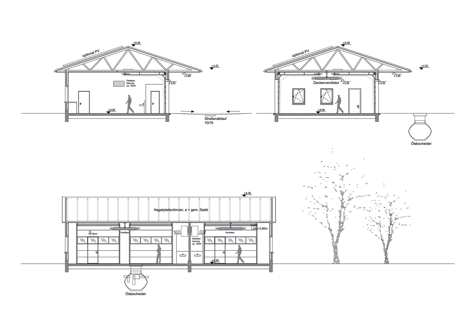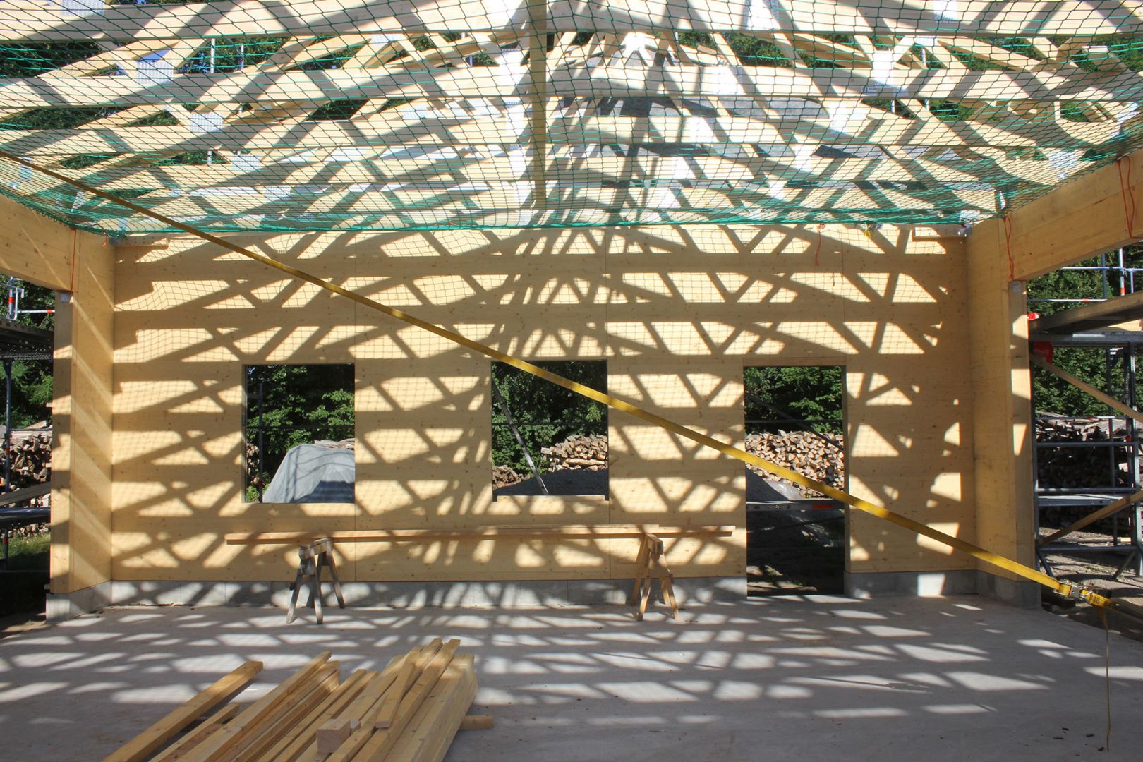 Umgesetzt wurde die Zimmermannskonstruktion als Holzständerwerk mit einem drei Meter weit auskragendem Satteldach aus Nagelplattenbindern. Der zeitgemäße Holzbau orientiert sich an den historischen Vorbildern und fügt sich harmonisch in das Bestandsensemble und die Natur ein.
