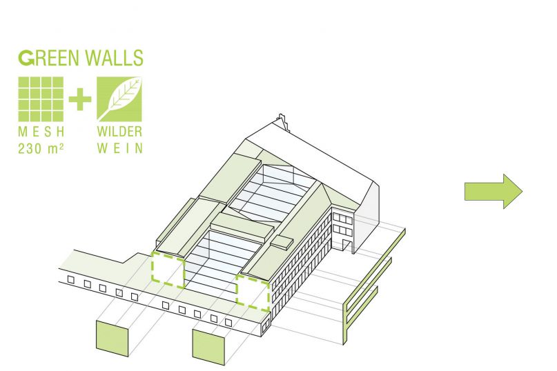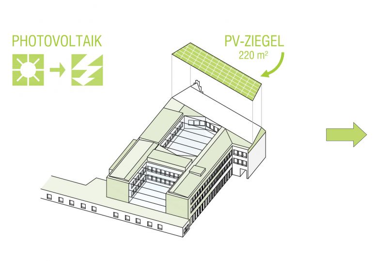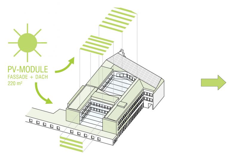 Die neuen Glasdächer und Fassaden der Atrien werden mit PV-Modulen ausgestattet. Dadurch wird eine jährliche Eigenleistung von 100 KWp an regenerativer Sonnenenergie geerntet.