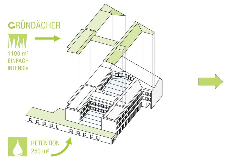 Im Gebäudebestand stecken wertvolle graue und ressourcenbezogene Energien. Durch den Re-use Ansatz und den überwiegenden Erhalt des Bestandes wird das gewaltige Potential dieser Energien genutzt und erhebliche Mengen an CO² eingespart. Emotionen und Erinnerungen, die Seele des Hauses: diese goldene Energie wird durch den behutsamen Eingriff und eine nachhaltige Umbaukultur erhalten.