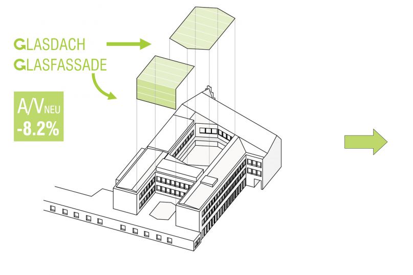 Neuen Glaseinhausungen der Atrien verbessern das A/V Verhältnis um 8,2%. Die Energieverbräuche für Strom, Heizung, Kühlung und Lüftung werden massiv reduziert.