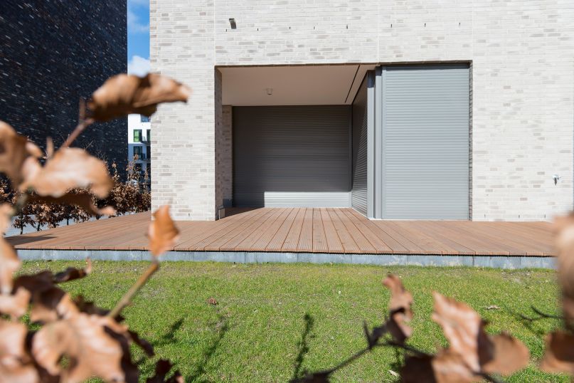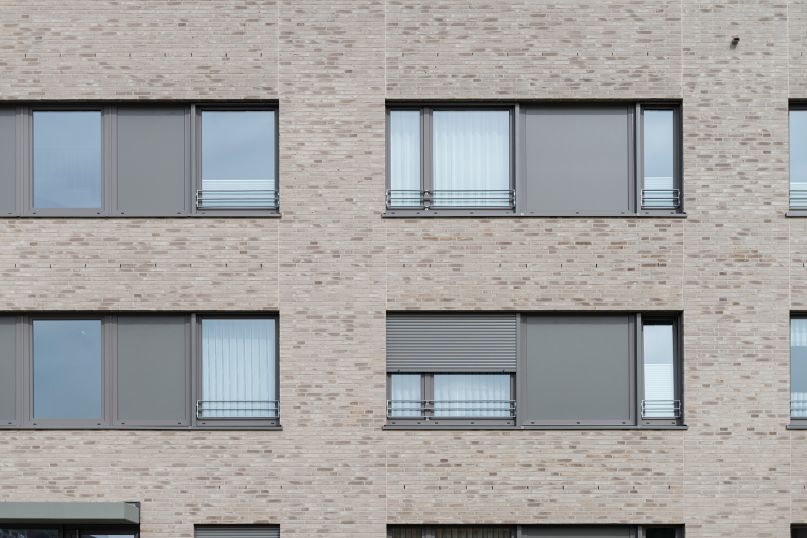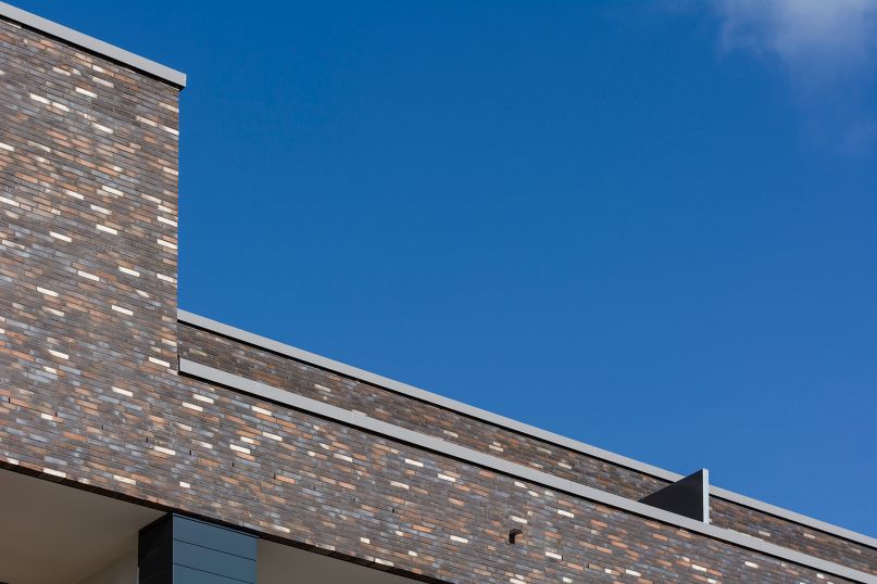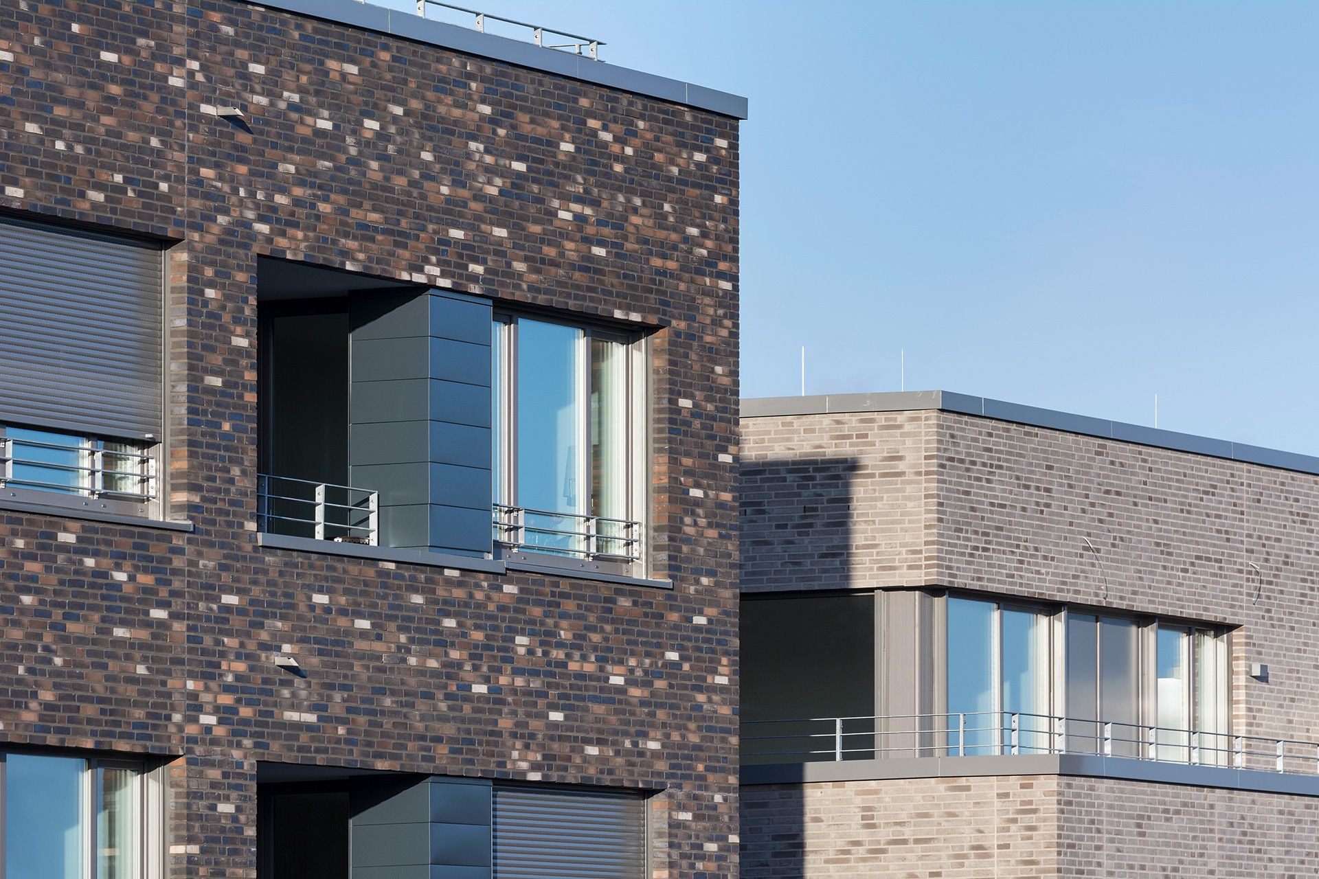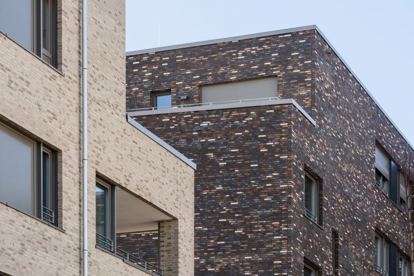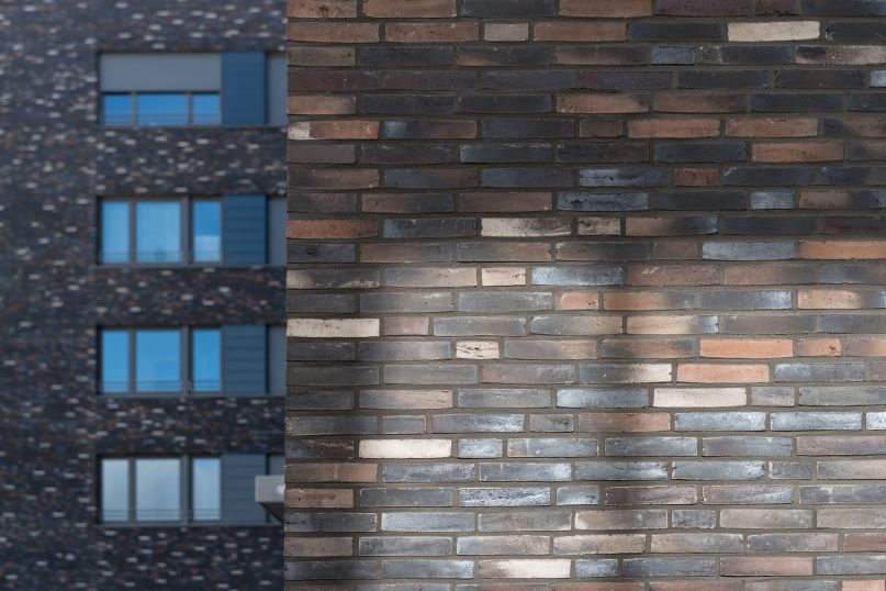 Die Fassaden der beiden Backsteinkörper sind aus einem hochwertigem Vollklinker in kontrastierendem Farbspiel gestaltet, das jeweils die Töne des Gegenübers aufnimmt. So bilden sie auch farblich eine harmonische Einheit.