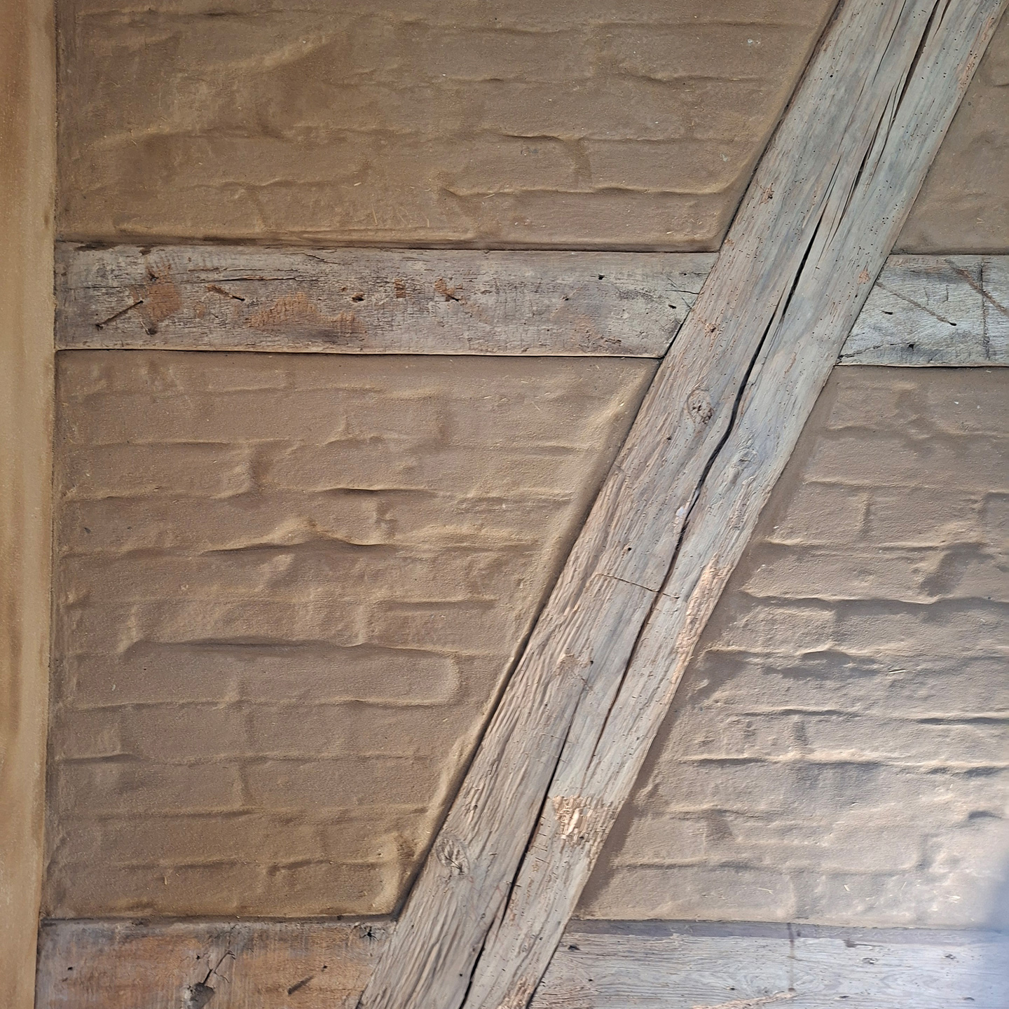 The wood shows its age and bears many scars, the clay bricks in the compartments are clearly visible and form a strong relief under the applied clay slurry. Rustic and...visible & beautiful!