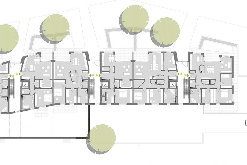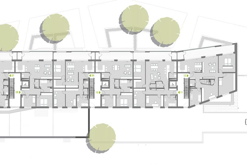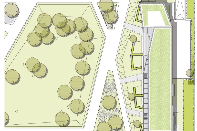 The new building in the heart of Lüneburg's Hanseviertel sets strong, conceptual accents and connects with the green town square through projecting and receding storey levels, layering and references to the surroundings. The gently sloping attic lines strengthen the dynamic overall figure.