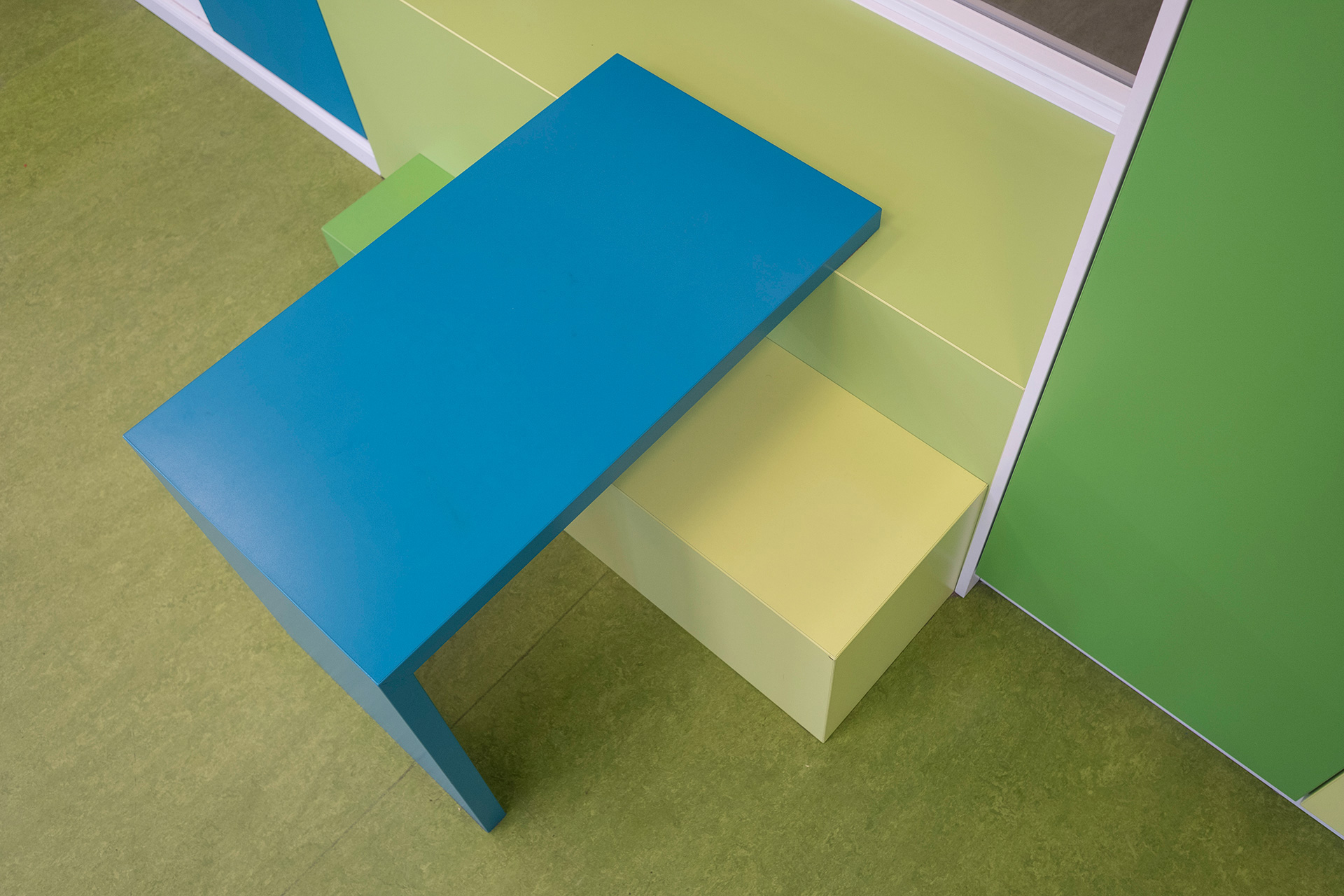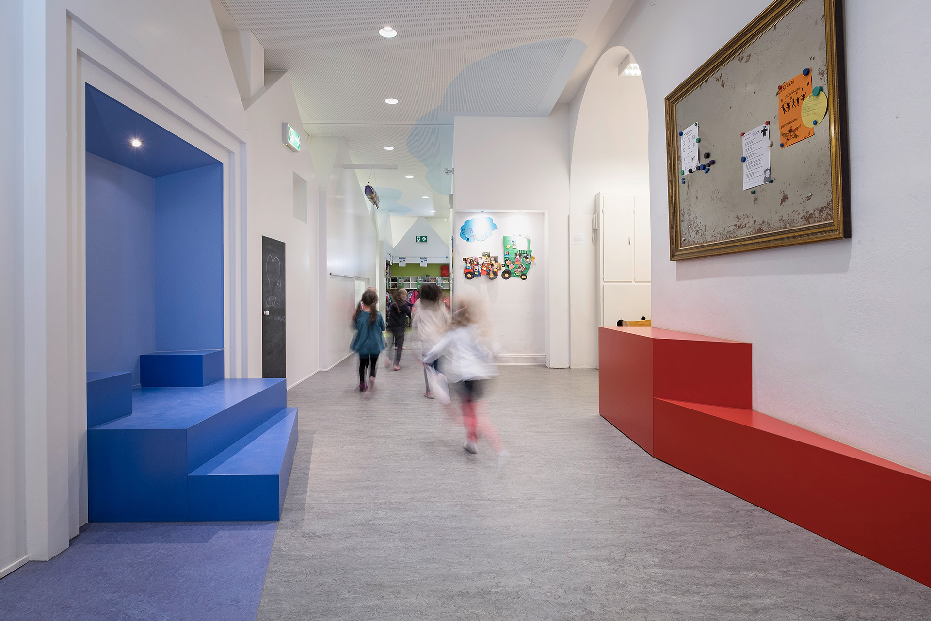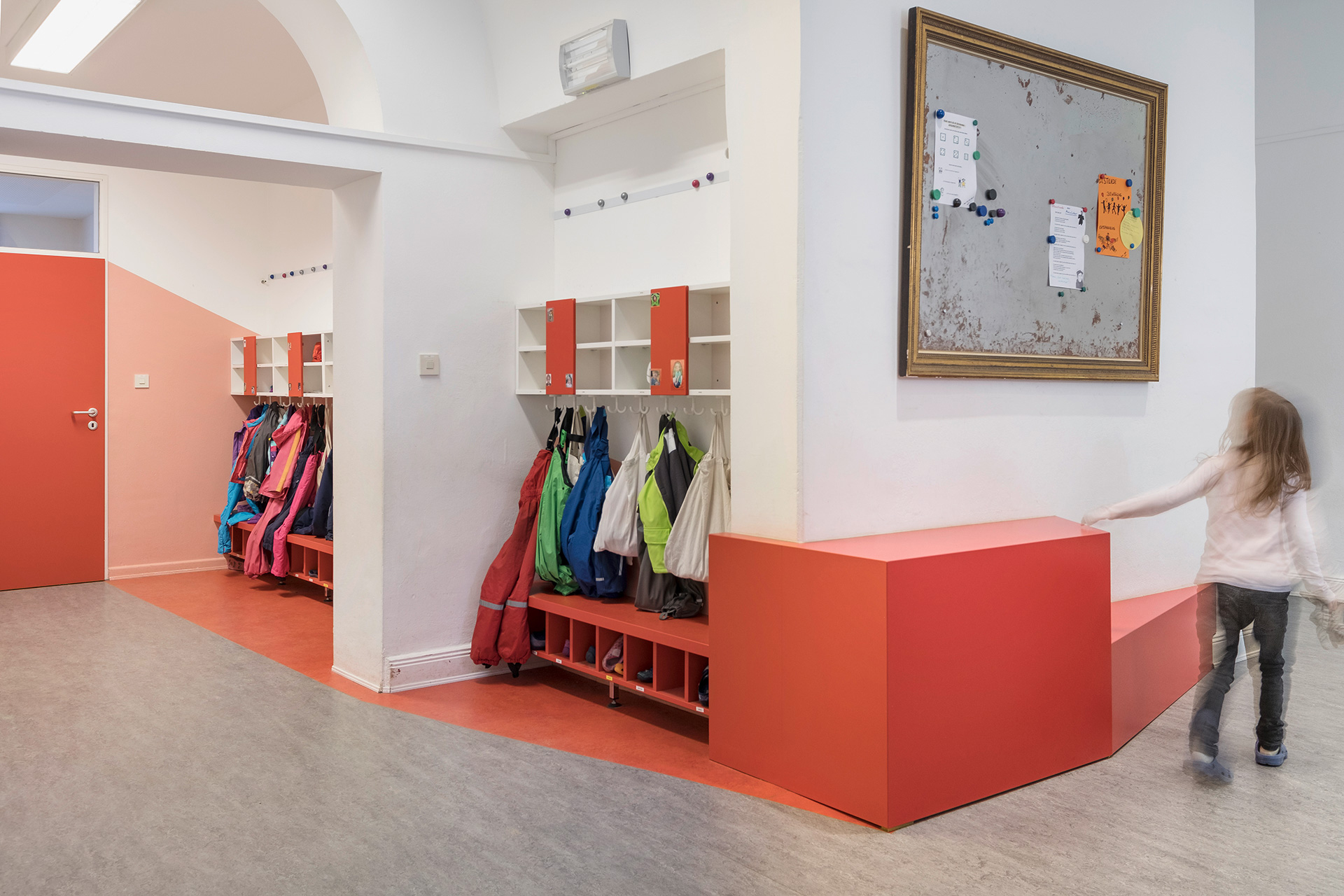 A clear color scheme and a schematic language of forms support the children's everyday orientation and identification. These are evident in floor surfaces, as well as in furniture and wardrobes.
