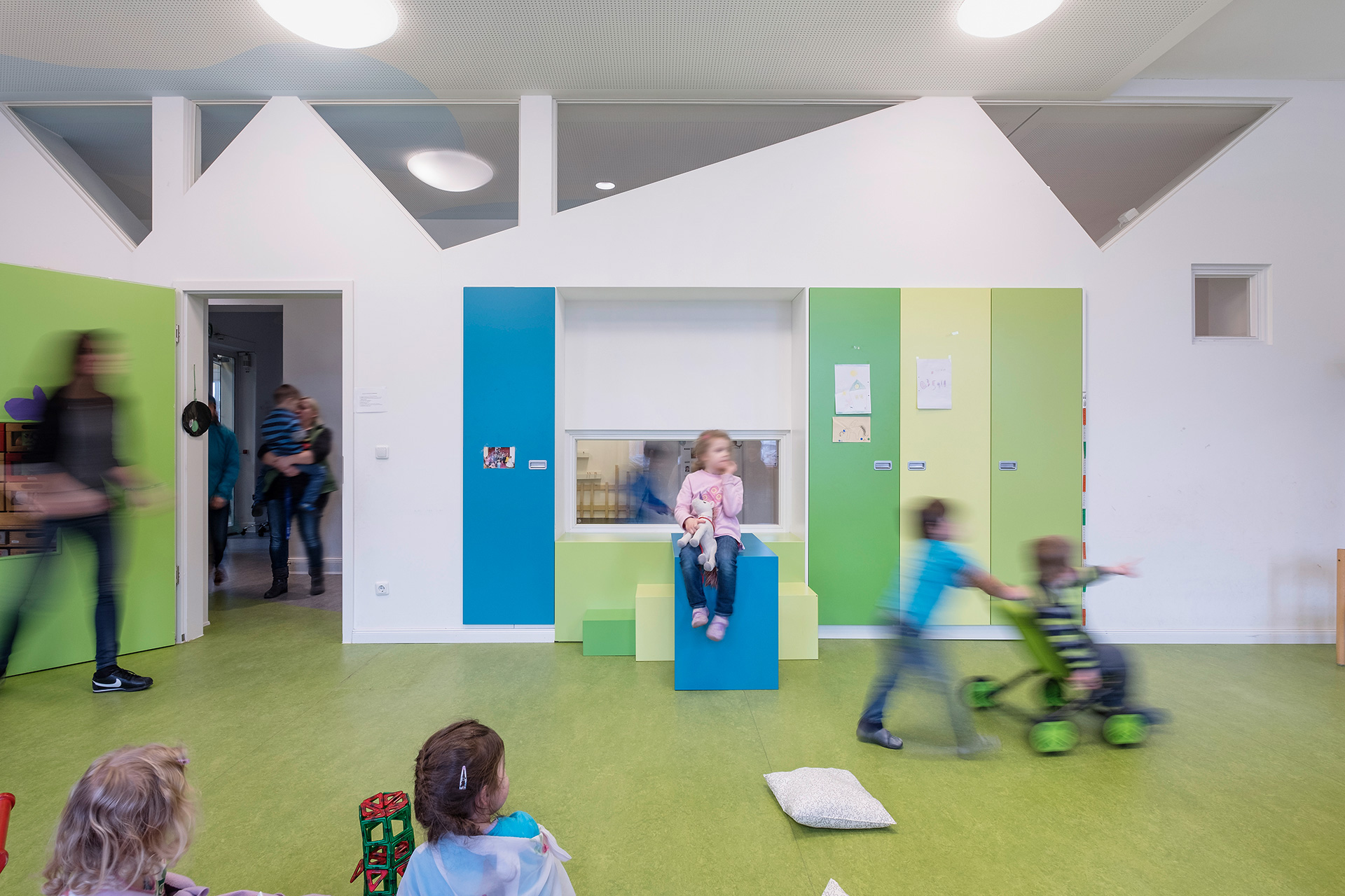 Following the urban structure, the gable facades typical for Lueneburg design the corridor areas and group rooms and create an identification with the own hometown and the inner-city location.