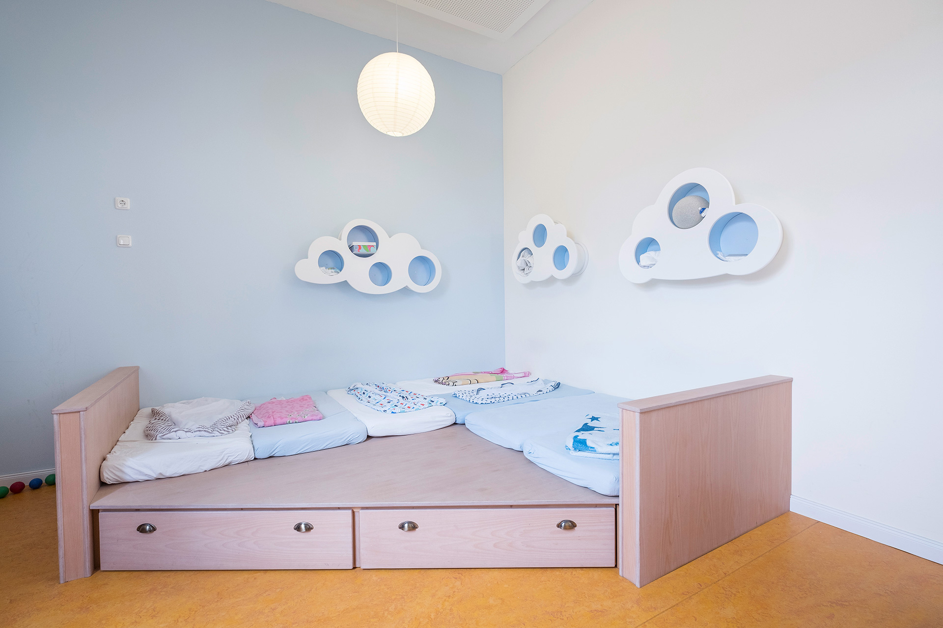 Play area in the morning and a heavenly bed for naps later. The platform in the crib area offers multifunctional possibilities and enough storage space for the blankets and mattresses during the play phases.
