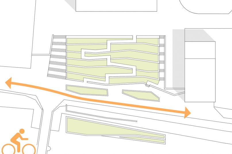The water square brings together surrounding uses and invites people to relax on its grassy landscape. The urban integration of living, culture and nature is strengthened by short paths, targeted integration into the surroundings and visual relationships between churches and the water tower. Barriers due to elevated projections are removed and missing connections from public to private space are created.