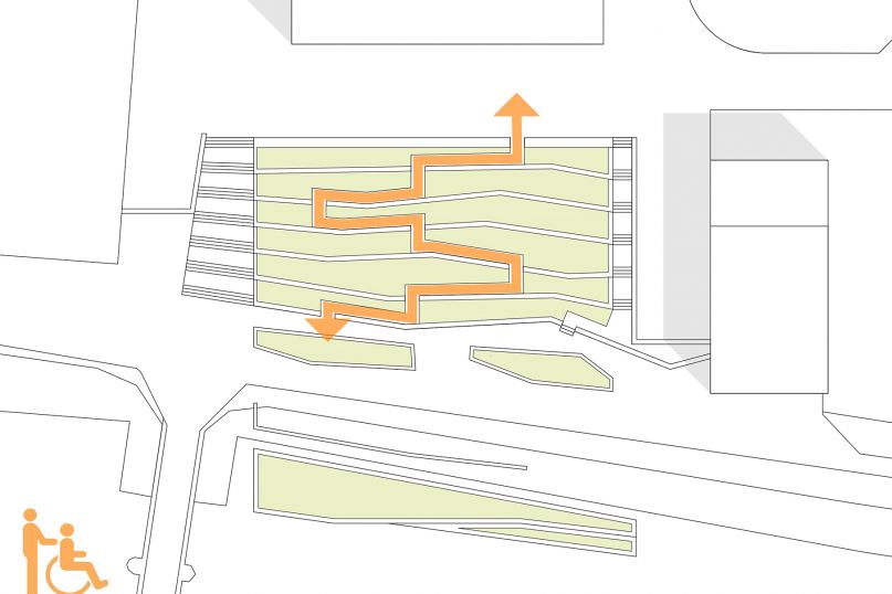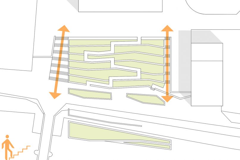 The water square resembles a terrace in public space, whose seating steps begin to shear up within their rectangular frame and flow into a landscape composition of green clods, from which field maples grow in sculptural gesture.