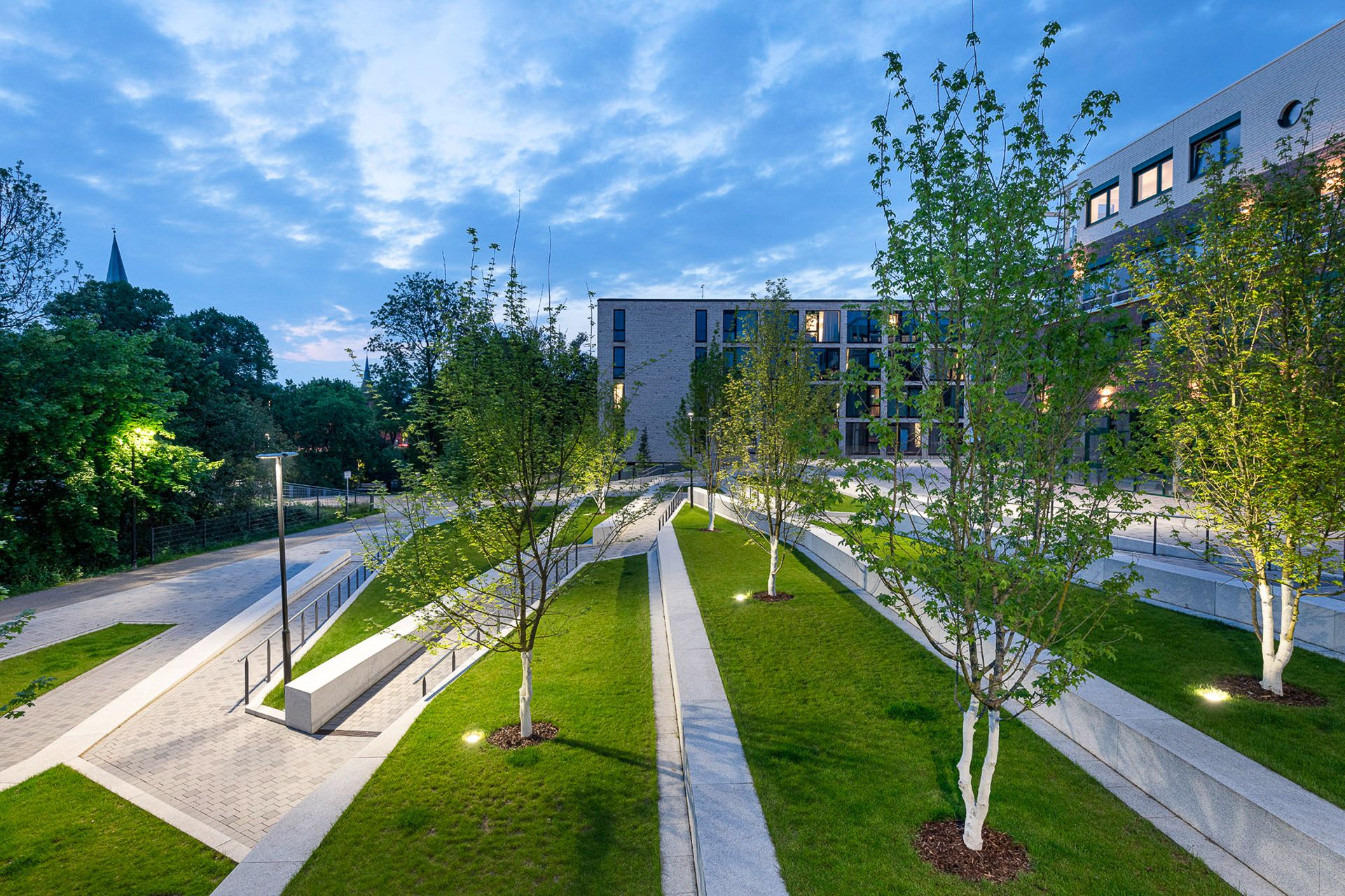 During the design work for the adjacent multi-story residential buildings, the conceptual design of the water square in the Ilmenaugarten was developed. Half of the square covers an underground car park, which results in a height offset of about three meters. This was taken as an opportunity to staircase the square with seating steps towards the Ilmenau and arrange it with green spaces. Bruun & Möllers landscape architects accompanied the concept development and transferred it into the further planning.